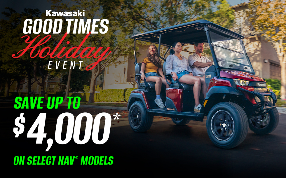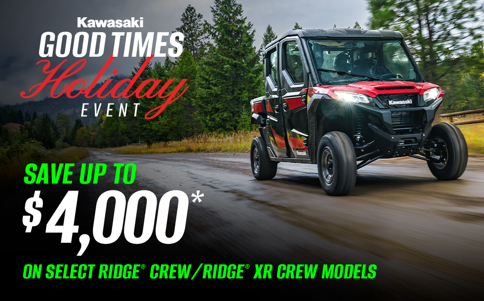 *Model & year exclusions apply. May be combined with promotional retail financing rates. Incentives are available at participating Kawasaki dealerships. Offer valid through 12/31/2025. Subject to change without notice. Offer available on approved purchases of select new unregistered Kawasaki vehicles.